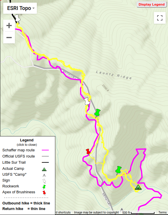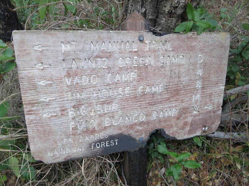 Total hike time was 9.6 hours.  A sense for the roughness of trail and hike difficulty can be seen in our hiking speeds: 1.7 mph (steep uphill) and 2.0 mph on our outbound and return legs along the Little Sur Trail but slowing to 0.38 mph and 0.33 mph respectively on the Mount Manuel Trail to the camp.