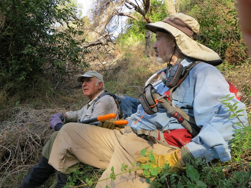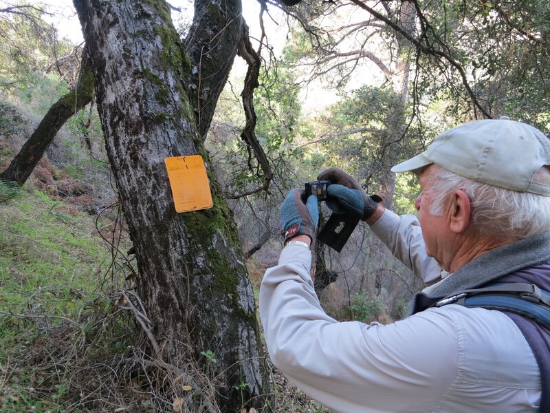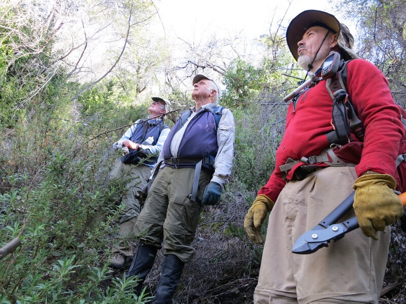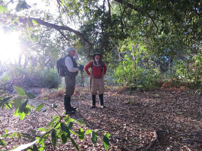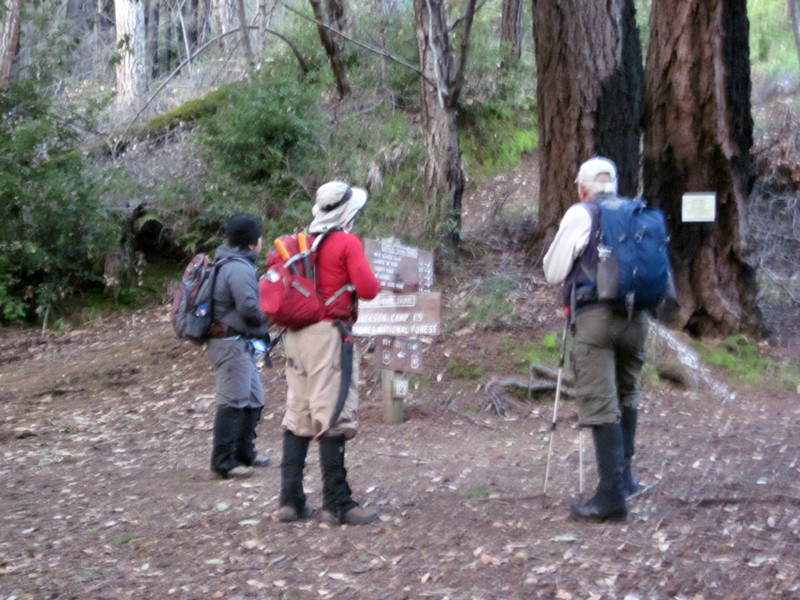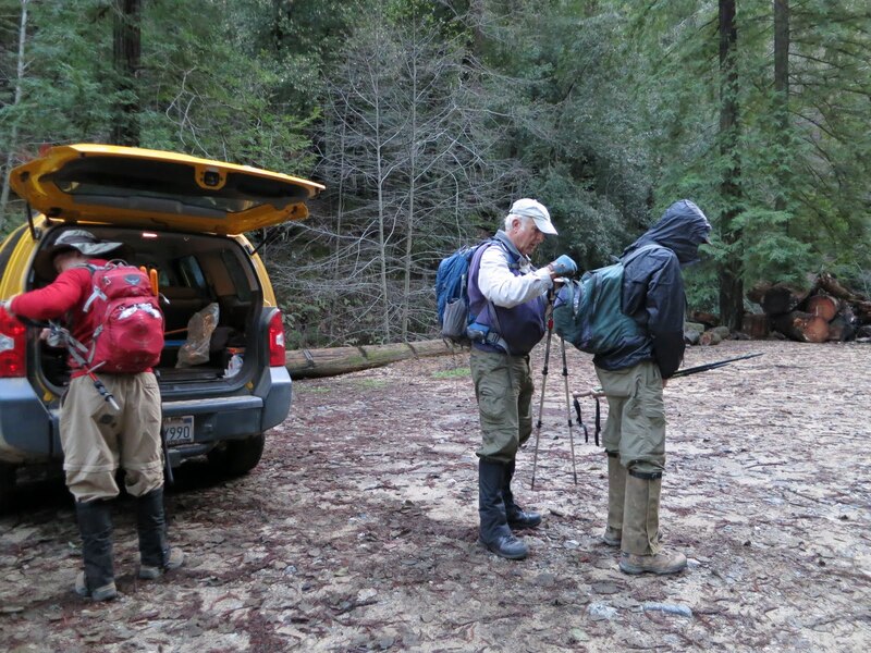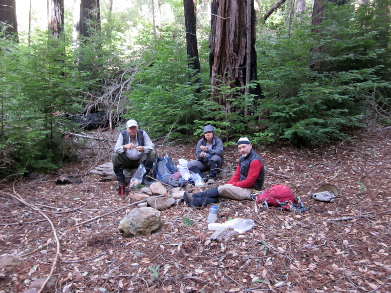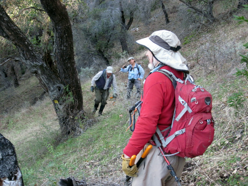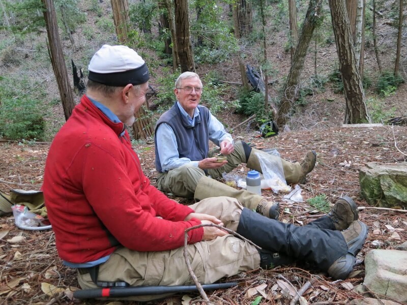 Launtz Creek Camp having been “found”, Paul Danielson and I wanted to bring some friends out, to show them the trail and camp – and to get additional help clearing the trail.  So eight months later, January 2013, we arrived at Pico Blanco Scout Reservation along with Maria Ferdin (a founder of Monterey Bay Area Hiking Group and frequent hiking companion of mine) and Burke Siedhoff (a grand old hiker always brimming with enthusiasm).