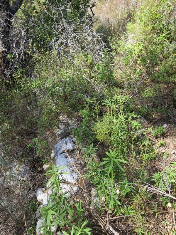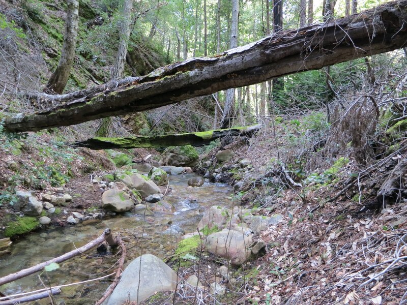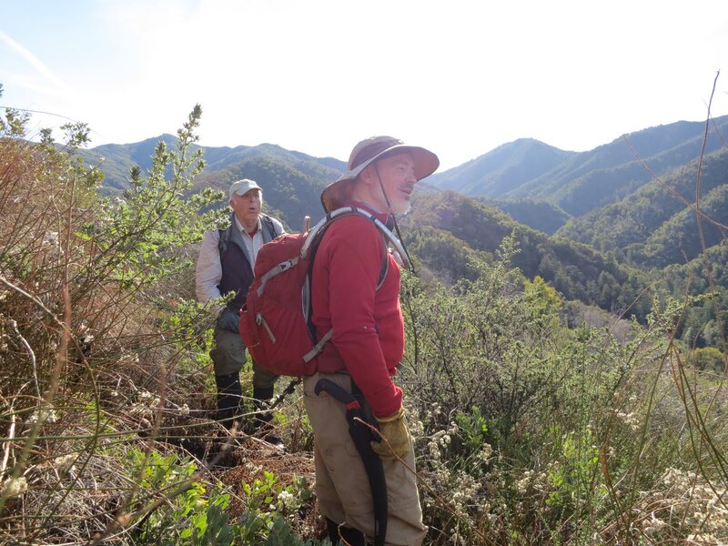 HOWEVER our past hikes had always been difficult around the “Apex of Brushiness” SO this time I wanted to try bypassing it, shortening the route via a bushwhack.  Past the trail-identifying rockwork, we headed upslope and over the ridgeline – giving a good view of the Little Sur River drainage